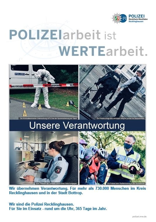 An der landesweiten Veranstaltungsreihe „POLIZEIarbeit ist WERTEarbeit“ beteiligen sich die Polizeibehörden mit verschiedenen Initiativen. Das Polizeipräsidium Recklinghausen legt dabei den besonderen Fokus auf den Wert „Verantwortung“.