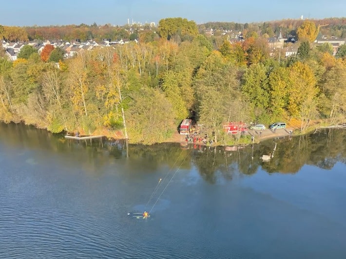 Aufmerksame Anlieger des Heider Bergsees meldeten am Sonntagmorgen gegen 08:00 Uhr einen Pkw, der in ca. 30 Metern Entfernung vom Ufer im See treiben soll.