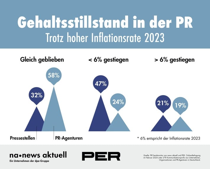 Gehaltsstillstand in der PR: Trotz hoher Inflationsrate sind die Gehälter vieler PR-Fachkräfte im Jahr 2023 nicht gestiegen. In Zahlen ausgedrückt bedeutet dies, dass 80 Prozent der Kommunikationsprofis in Deutschland im vergangenen Jahr keine Gehaltserhöhung erhalten haben oder ihr Gehalt lediglich unter der Inflationsrate gestiegen ist. Dennoch ist nur jede und jeder Fünfte mit dem eigenen Einkommen unzufrieden. Ebenfalls jede und jeder Fünfte denkt darüber nach, wegen des Gehalts den Job zu wechseln. An der Umfrage zum PR-Trendmonitor von news aktuell und PER haben 278 PR-Fach- und Führungskräfte aus Deutschland teilgenommen.