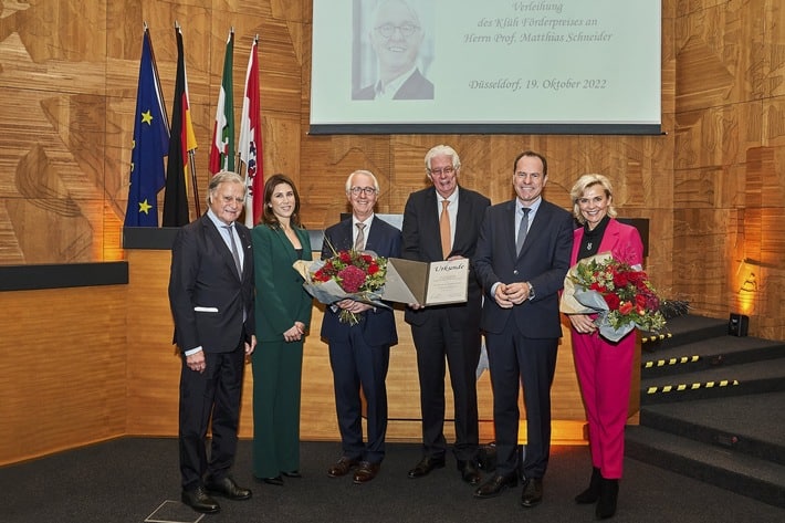 Der mit 25.000 Euro dotierte Preis der Klüh Stiftung zur Förderung der Innovation in Wissenschaft und Forschung geht in diesem Jahr an den Rheumatologen und Spezialisten für Autoimmunerkrankungen und Endokrinologie Prof. Dr. Matthias Schneider (67). Der Mediziner ist seit 1994 Professor für Innere Medizin und Rheumatologie an der Universität Düsseldorf und zudem Direktor des von ihm gegründeten Hiller-Forschungszentrums für Rheumatologie an der Universitätsklinik Düsseldorf.