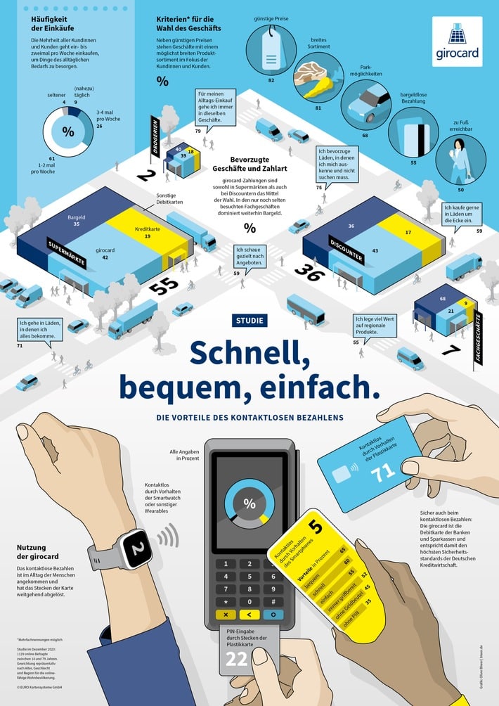 Im hektischen Alltag vieler Menschen gewinnt das kontaktlose Bezahlen zunehmend an Bedeutung. Ob im Supermarkt, beim Discounter oder in der Drogerie – mit einem kurzen „Bing“ wird der Bezahlvorgang in wenigen Sekunden abgeschlossen, ohne Münzen zu suchen oder eine PIN einzugeben. Die girocard spielt dabei eine zentrale Rolle und hat sich als feste Größe in den Bezahlalltag etabliert. Wie oft der Gang in den Supermarkt stattfindet oder nach welchen Kriterien die Auswahl der Einkaufsstätten erfolgt, zeigt eine Studie von infas quo im Auftrag der EURO Kartensysteme. Beim Bezahlen ist klar: Bequem, schnell und einfach muss es gehen.