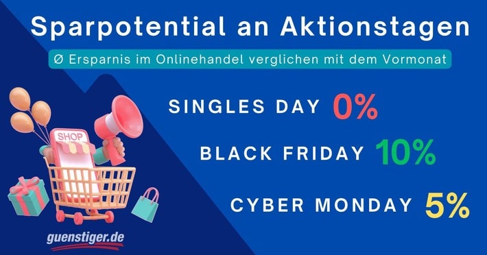 Alle Jahre wieder finden pünktlich zur Weihnachtssaison zahlreiche Rabattaktionen statt. Sei es der Singles Day, Black Friday oder der Cyber Monday – viele Shops werden in den kommenden Wochen erneut mit Sonderangeboten locken. Bei welchem Ereignis Verbraucher am meisten sparen können, hat das Vergleichsportal guenstiger.de anhand der Vorjahres-Aktionen ermittelt. Geprüft wurde, wie teuer ausgewählte Produkte aus zehn verschiedenen Kategorien im Vergleich zum Vormonat angeboten wurden. Demnach fiel das Sparpotential beim Black Friday am größten aus.