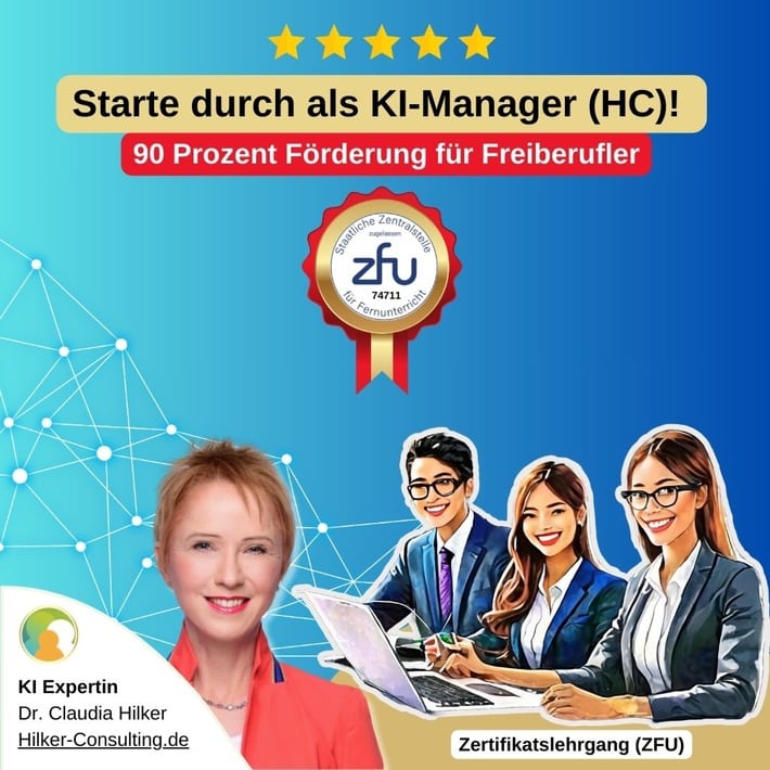 Ein wichtiger Vorteil ist die Zertifizierung des Kurses durch die ZFU (Staatliche Zentralstelle für Fernunterricht), die höchste Qualitätsstandards und eine breite Anerkennung im beruflichen Kontext garantiert. Zudem profitieren die Teilnehmer:innen von der persönlichen Betreuung durch Dr. Claudia Hilker, die als Marketing-Professorin und KI-Expertin über 20 Jahre Erfahrung in der Wissensvermittlung als Dozentin und Hochschullehrerin mitbringt.