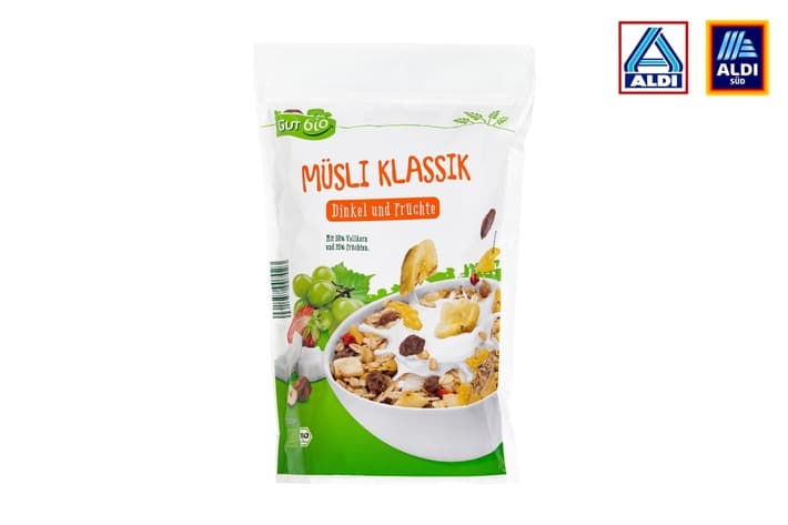 Die Süddeutsche Zeitung hat zehn Müsli-Produkte von Ernährungsberater Frank Polajner testen lassen. Inhaltsstoffe wie der Vollkorn- und Zuckeranteil, aber auch der Geschmack und die Art der Verpackung waren bei der Bewertung ausschlaggebend. Das Müsli „Klassik Dinkel und Früchte“ (2,89 Euro je 500g) der ALDI Eigenmarke „GUT bio“ überzeugte den Experten in allen Kategorien. Es sei im Vergleich zu anderen Müslis „um Längen besser und sein Geld wert“. Zum Vergleich: Andere getestete Müslis kosten bei nahezu identischer Füllmenge bis zu 7,89 Euro.