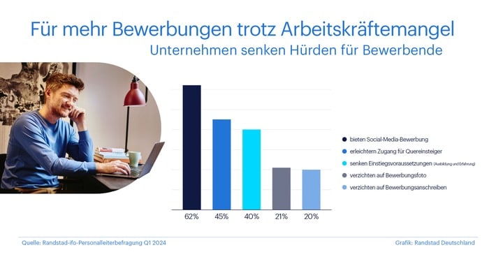 Deutschland kann New Work – nicht nur beim Arbeiten, sondern auch beim Bewerben. Über zwei Drittel der Firmen (77%) haben in den vergangenen fünf Jahren die Struktur von Stellenausschreibungen und Bewerbungsprozessen modernisiert. Ihr Ziel: Die Hürden möglichst niedrig halten, um trotz Bewerbermangel mehr Bewerbungen zu erhalten. Die aktuelle Randstad-ifo-Personalleiterbefragung Q1 2024 (https://www.randstad.de/hr-portal/personalmanagement/randstad-ifo-personalleiterbefragung/) zeigt, dass die Änderungen sowohl den Bewerbungsprozess selbst als auch die fachlichen Voraussetzungen betreffen.