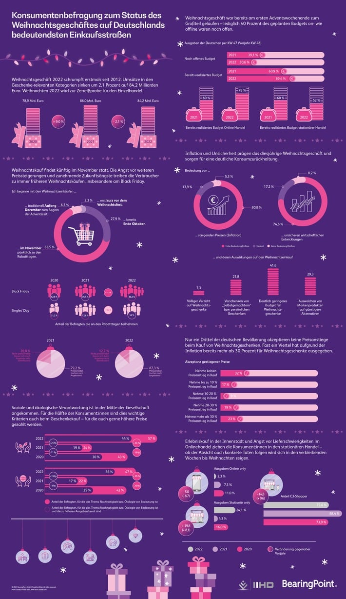 Konsument:innen sind durch Inflation und hohe Energiepreise tief verunsichert und geben insgesamt deutlich weniger Geld aus. So sinkt das durchschnittliche Budget für Weihnachtsgeschenke um 40 Prozent im Vergleich zum Vorjahr. Um Geld zu sparen, haben viele ihren Weihnachtskauf an den Rabatttagen im November getätigt – Stichwort Black Friday. Lediglich die Themen Nachhaltigkeit und Ökologie trotzen dem Trend. Das ist das Ergebnis der alljährlichen Konsumentenbefragung des IIHD-Instituts und der Unternehmensberatung BearingPoint zum Status des diesjährigen Weihnachtsgeschäfts auf Deutschlands meist frequentierten Einkaufsstraßen.