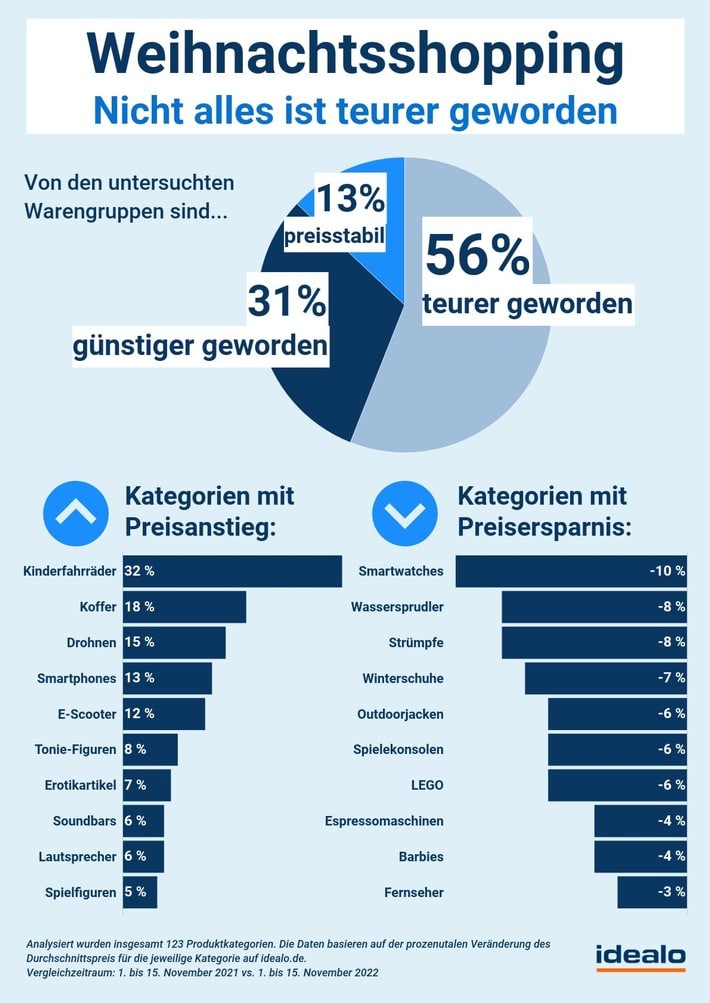 Die Analyse zeigt, dass nicht alles teurer geworden ist: Für etwas mehr als die Hälfte der untersuchten Kategorien (56 Prozent) kann idealo zwar eine Preissteigerung feststellen – rund ein Drittel (31 Prozent) ist aber günstiger geworden. Die restlichen Warengruppen (13 Prozent) zeigen sich preisstabil.