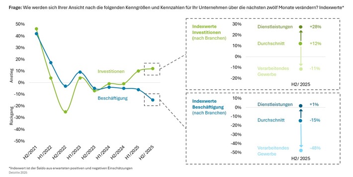 „Neue Investitionen werden aktuell vor allem von Technologieunternehmen und Banken getrieben, die vom Boom um künstliche Intelligenz und den florierenden Aktienmärkten profitieren dürften“, analysiert Dr. Alexander Börsch, Chefökonom und Leiter Research bei Deloitte. „Das von der Politik besonders in den Blick genommene verarbeitende Gewerbe bleibt dagegen nach wie vor zurück – ein Ende des Beschäftigungsabbaus und der Zurückhaltung bei Investitionen ist für die Finanzvorstände in der Industrie nicht in Sicht.“